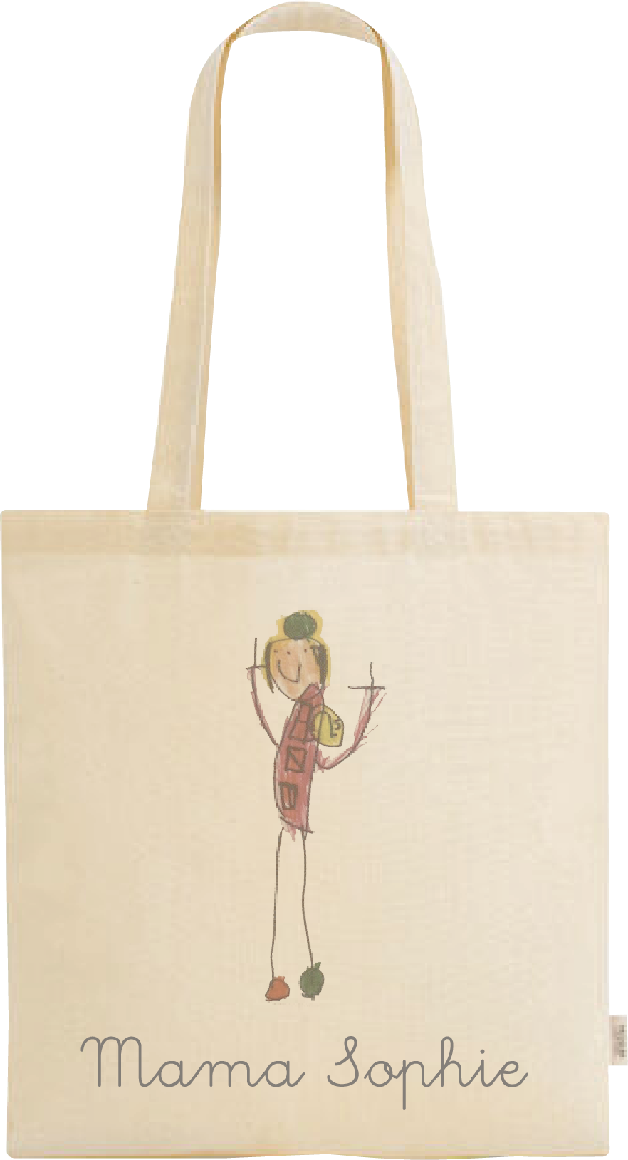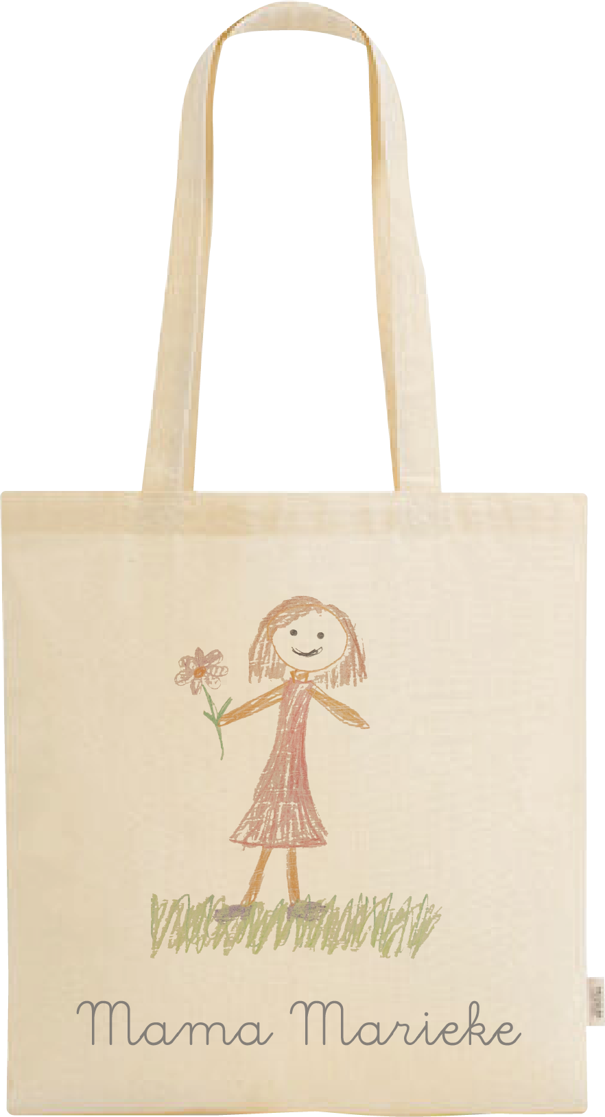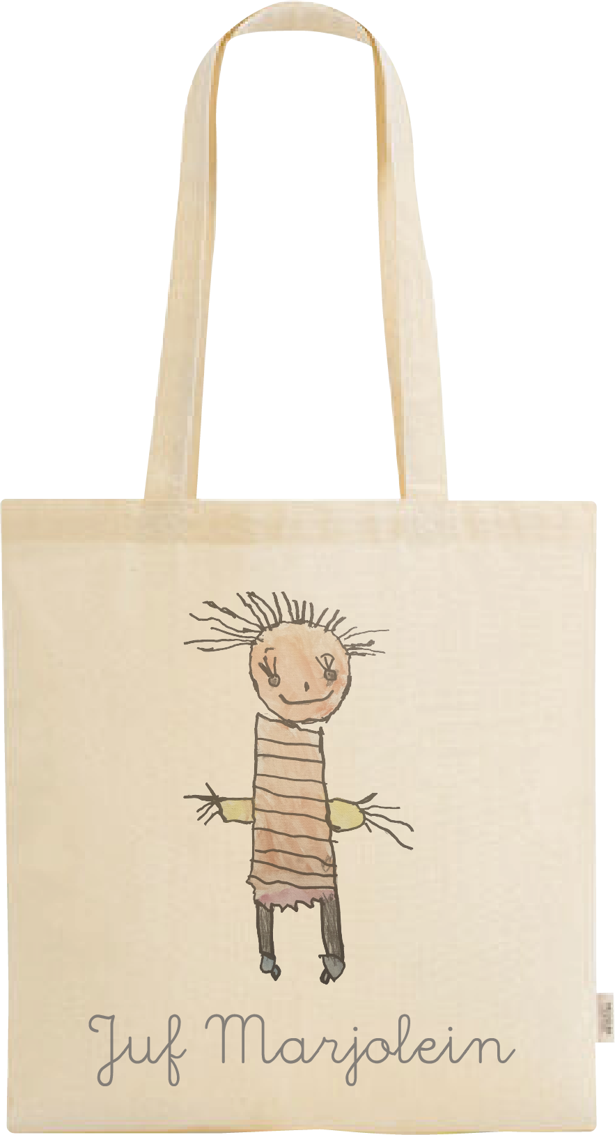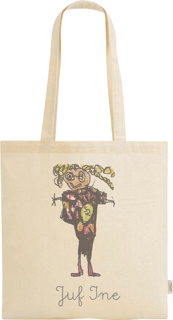 Laat een kindertekening vereeuwigen op een tas! Mail ons de foto van de tekening en wij personaliseren een unieke tas – perfect als origineel cadeau voor mama, juf, opa of oma.